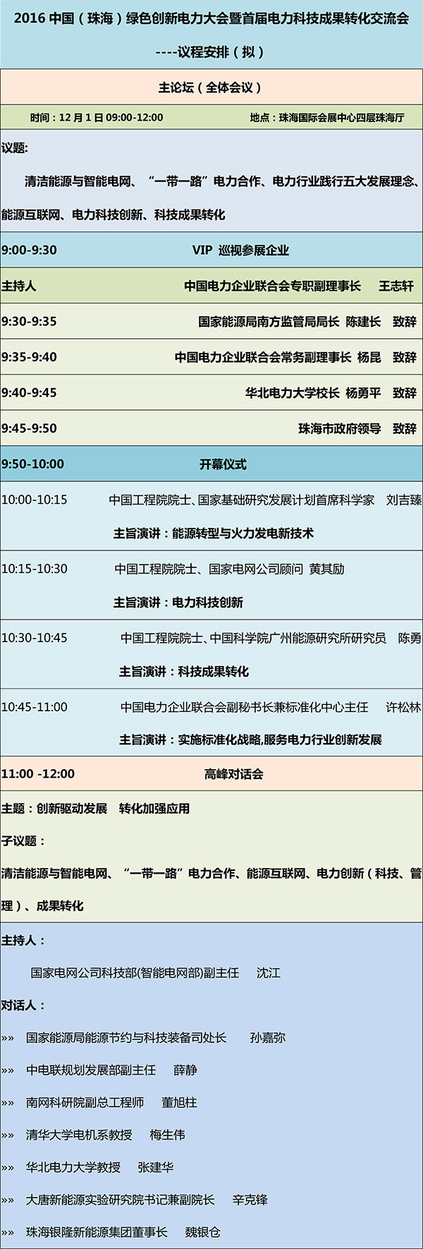 大会已邀请到中国电力企业联合会专职副理事长王志轩主持大会,国家能源局南方监管局局长陈建长、中国电力企业联合会常务副理事长杨昆、华北电力大学校长杨勇平、珠海市政府领导为大会致辞。此外在大会开幕式上将有中国工程院院士、国家基础研究发展计划首席科学家刘吉臻,中国工程院院士、国家电网公司顾问黄其励,中国工程院院士、中国科学院广州能源研究所研究员陈勇,中国电力企业联合会副秘书长兼标准化中心主任许松林等做主旨演讲,针对电力行业如何实现绿色转型升级提出建设性意见。